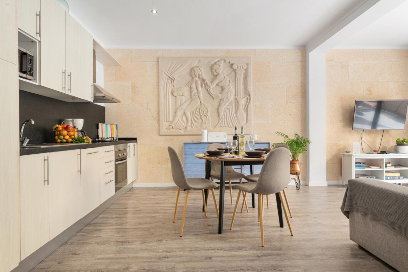 Two-Bedroom Apartment. Boasting a private entrance, this spacious apartment also includes 2 bedrooms, a seating area and 1 bathroom with a shower and a hairdryer. In the fully equipped kitchen, guests will find a refrigerator, a dishwasher, kitchenware and an oven. This air-conditioned apartment features a dining area, a flat-screen TV with satellite channels a washing machine and a terrace. The unit has 3 beds.