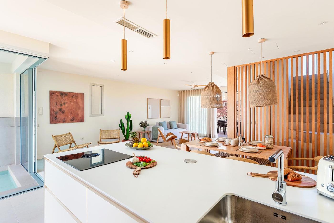 Three-Bedroom House. This holiday homes special feature is the private pool. This spacious holiday home comprises 1 living room, 3 separate bedrooms and 3 bathrooms with a shower and free toiletries. The well-equipped kitchen features a stovetop, a refrigerator, a dishwasher and kitchenware. The air-conditioned holiday home provides a flat-screen TV, a washing machine, a private entrance, a tea and coffee maker as well as garden views. The unit offers 5 beds.