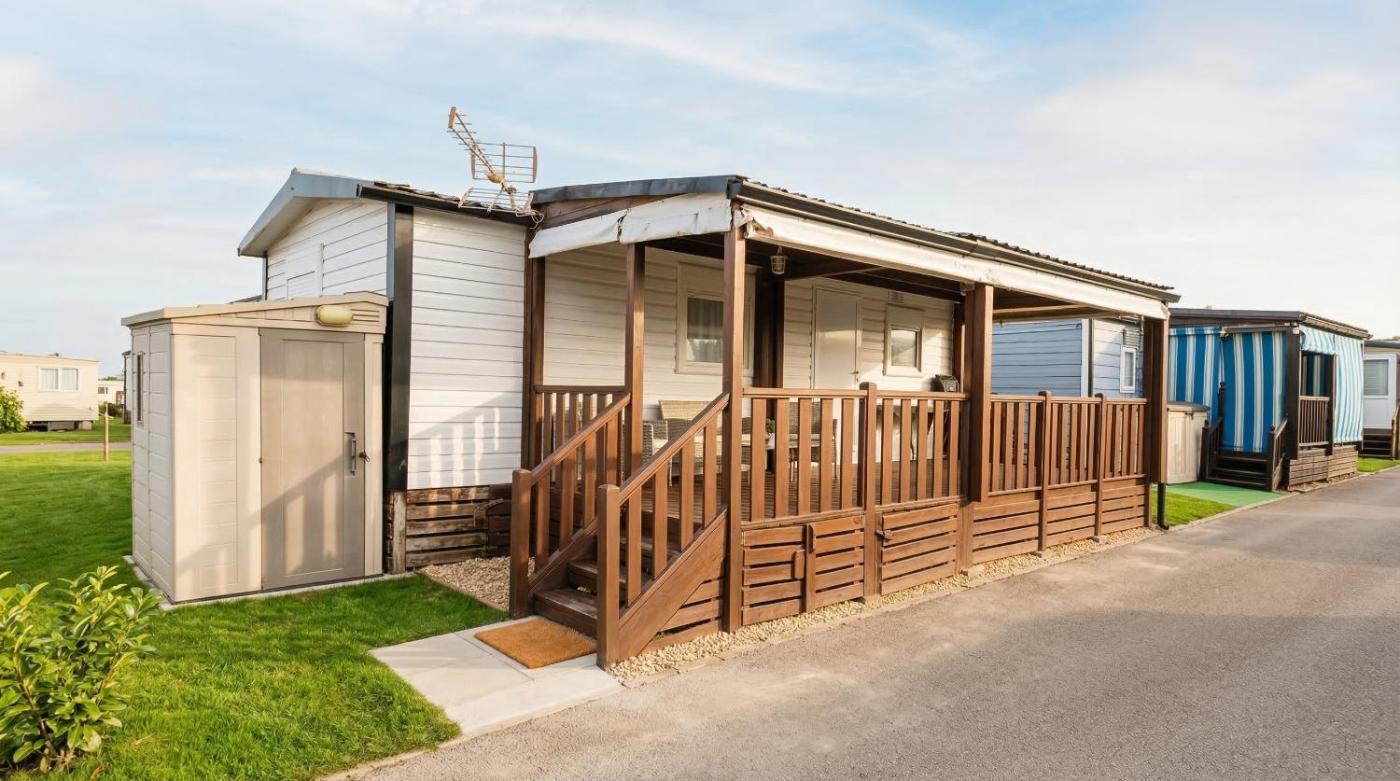 Bungalow. This mobile home has simple, lightly coloured décor. There is a seating area with a flat-screen TV and a sofa, and the kitchenette includes a fridge and a coffee maker. Bed linen is included. There is a double bedroom and a twin room. ;