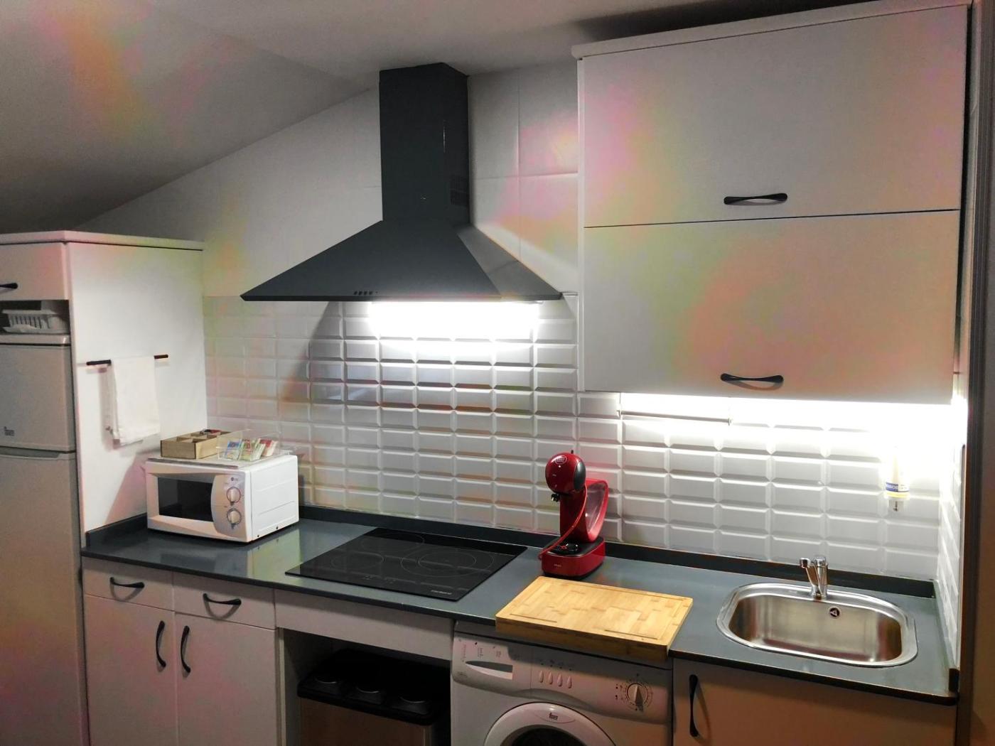 All of the spacious apartments come with a washing machine. They each have an open-plan kitchenliving room with a fireplace. There is a dining table, a bathroom and a TV.
